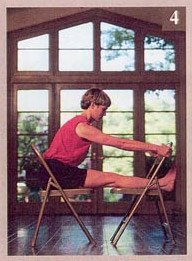 Seated Forward Bend Sit on one chair, with another chair facing you. Picking up your legs with your hands, stretch your legs out across the seats of both chairs. Bending forward at the hips, rest your hands on top of the opposite chair back. Spread your fingers. Do not grip. |